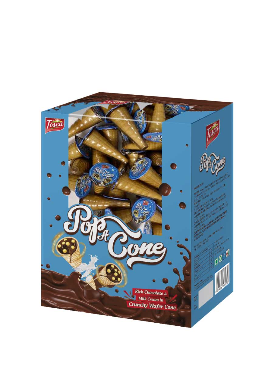 Pop a cone is a wafer cone that is usually made with flour, a sweetener like sugar, cocoa powder with some emulsifiers etc. The wafer has a firm brown crust and crunchy interior. They are commonly eaten as a snack but can also be used for various recipes or DIY Activities. The chocolate wafer cone should be stored in airtight containers. It is are a quick source of Carbohydrates thus keeping the hunger away. Chocolate wafer made with wheat flour is a rich source of the vitamin -B complex vitamins and dietary fibre.